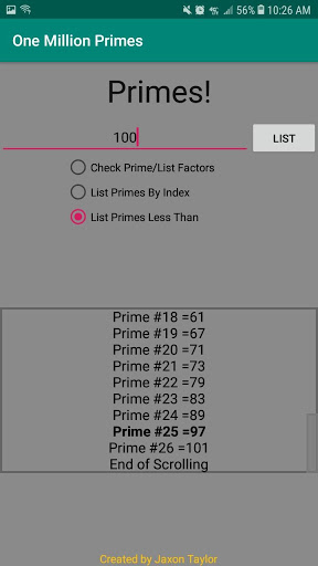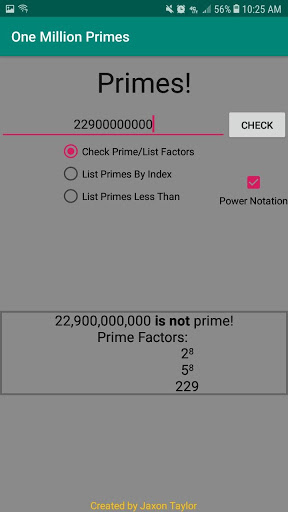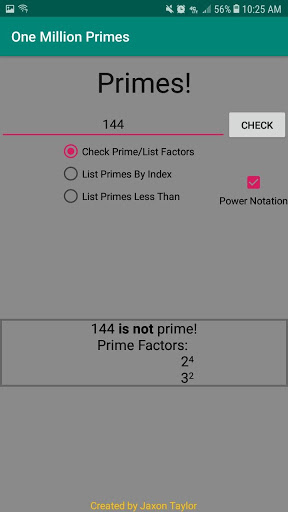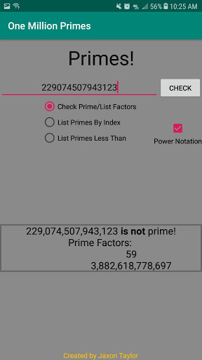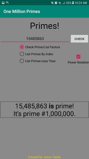This app will check any number you enter to see if it is prime (up to 239 trillion). If a number you check is not prime, One Million Primes will list the prime factorization of that number. One Million Primes will also list primes by index (e.g. the 567,000th prime) and up to 50 primes before and after. It will also list up to 50 primes underneath a given number (e.g. list all primes under 100). Please rate and review, this is my first app.