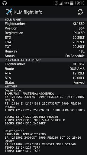 My Flight Info provides information on your next KL flight in your calendar. Useful for flightcrew to keep informed about delayed inbound flights, gate and weather. It can send push notifications on a set time before your flight.