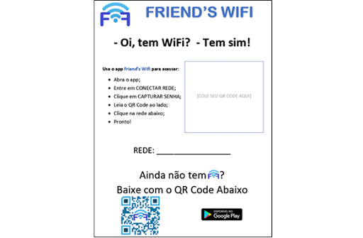 FRIEND'S WI-FI é um app para compartilhar de forma rápida e segura a senha da rede wifi de sua casa, estabelecimento comercial ou de algum evento.