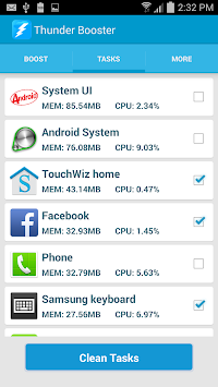 Boost your RAM with single touch. Touch boost button and clear running process. In Tasks tab you can swipe to clean individual process from ram memory. In more tab you also know about your internal and external memory status.