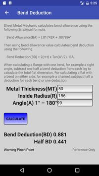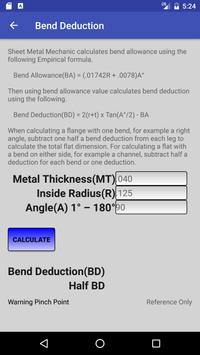 Sheet Metal Mechanic includes a simple bend deduction calculator using metal thickness, radius, and angle.