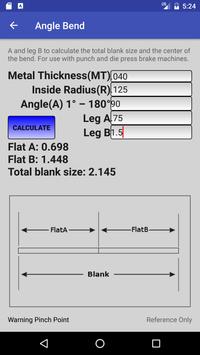 The angle bend calculator uses metal thickness, radius, bend angle, leg A and leg B to calculate a flat metal blank. It also provides the recommended minimum cold bend radius for aluminum alloys to help you get the tightest bends without cracking material.