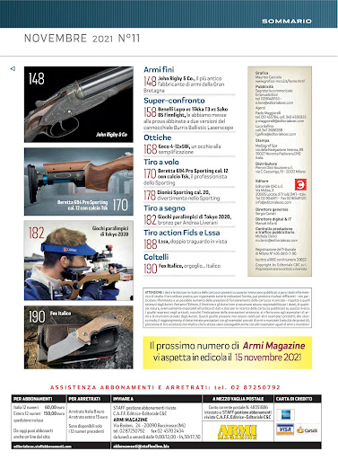 Hem kısa hem de uzun süreli spor, tahsil, askeri, avcılık ve çekimde uzman dergi. 1991'den beri Armi Dergisi, tekniğin, güvenilirlik ve otorite ile sektörün referans dergisi olarak kabul edilir. Uzmanlığı sayesinde, endüstrinin ve profesyonellerin tanınması, makalelerinin genel kamu tanımında ve içeriğinde ürettiği ilgi için de kazanılmıştır: savunma silahları, taktiksel ve avcılık karabinleri, spor silahları, tahsil silahları, mühimmat, adli balistik, spor etkinlikleri , hukuk sektörü, iş sunumları. Ayrıca, sürgünün sporları için faaliyetlerin, ürünlerin ve bilgilerin yönleri ile de ilgilenmektedir. Armerli disiplinin yasal yönü çok dikkatlidir.