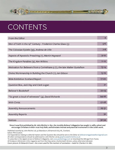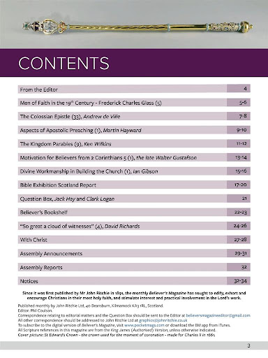 Believer’s Magazine consistently promotes such Bible truth as eternal salvation of repentant sinners by divine grace alone, through faith alone, in the Person of the Lord Jesus Christ alone. The Bible is held to be the inerrant Word of God, inspired by the Holy Spirit, and the final authority in respect of all doctrine and practice for the Christian.
