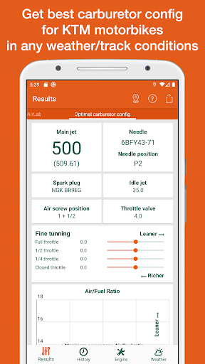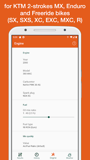This app is using temperature, altitude, humidity, atmospheric pressure and your engine configuration for calculate optimal jetting (carburetor configuration) and spark plug to use for KTM 2-strokes MX, Enduro and Freeride bikes (SX, SXS, XC, XC-W, EXC, MXC, R models).