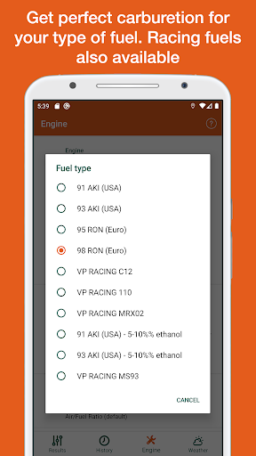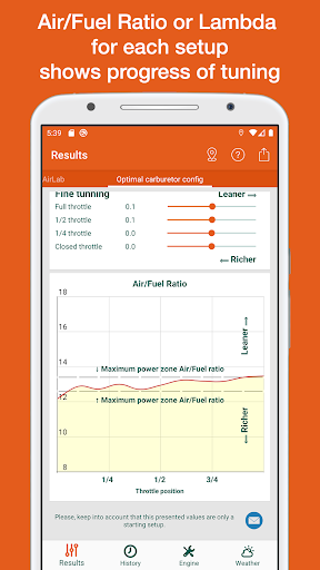 • Results: In this tab main jet, needle type, needle position, pilot jet, air screw position, throttle valve, spark plug are shown. These data are calculated depending on the weather conditions and the engine configuration given in the next tabs.