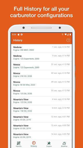 • History: This tab contains the history of all carburetor setups.