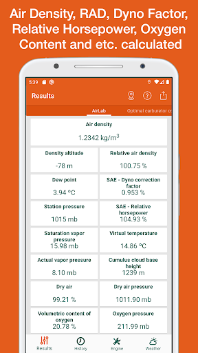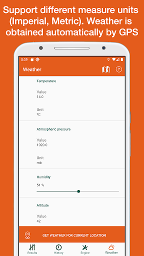 This app can obtain automatically the position and altitude to get the temperature, pressure and humidity from the nearest weather station thought internet. Internal barometer is used on supported devices for better precision. If more accuracy is needed, a portable weather station can also be used. Application can run without GPS, WiFi and internet, in this case user has to give the weather data manually.