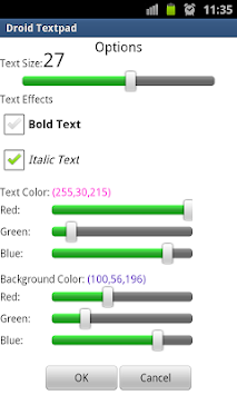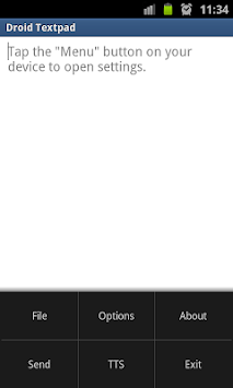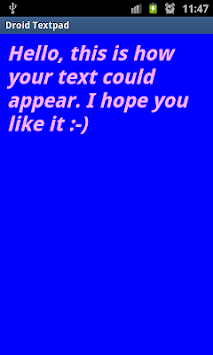 Droid TextPad is simple text editor, that allows you to create, edit and save your text documents. You can change size, type and color of your text and change color of background in this application. You can also send your text document via email or Skype or let your device read your file using TTS button (text-to-speech).