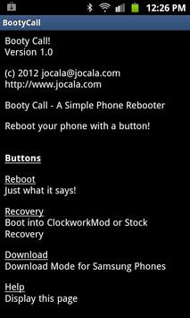 Booty Call is a simple rebooter for your phone or tablet. It allows you to reboot, reboot into recovery and for Samsung devices reboot into download mode. This app does require root!