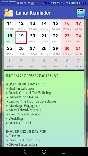 Showing Auspicious Days (Lucky Days), Inauspicious Days (Unlucky Days) and Auspicious Time (Lucky Time) on picked date in the main calendar