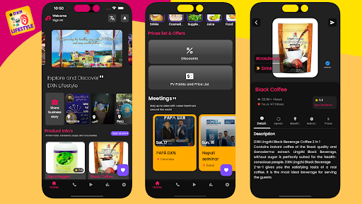 In this app you will find almost everything helping about DXN. This app will continuously update all the DXN products, Product price, Points and all related information. It will also help you to find nearby DXN Dealer Shops with their contact, address and details. Here you will find all news about DXN. This App shows you all the seminar Updates.