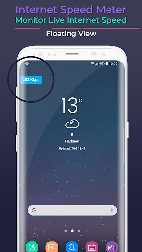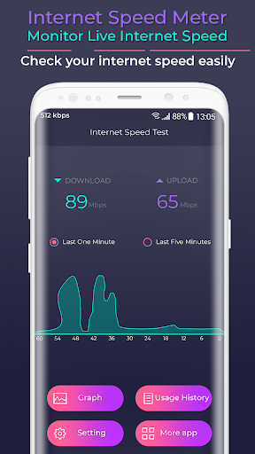 is application which work to show your current internet speed with graphics and also floting views.this internet speed meter display live internet speed and data use.
