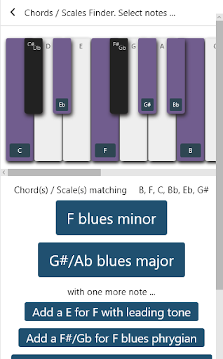Within this application you can visualize all chords and scales on your keyboard, display and listen corresponding notes structure.