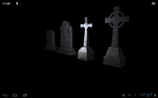 Spooky 3D halloween live wallpaper. Flickering light, tomb stones and a pumpkin.