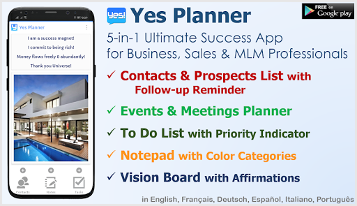 Yes Planner is the 5-in-1 ultimate app you'll ever need to succeed in sales, network marketing and multi-level marketing industry.