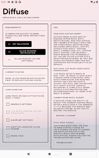 - Diffuse grabs album arts by reading notifications posted by your music players, so please make sure that your music app is using the default system music notification before your purchase. Read more in the section below.