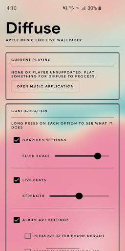 Meet Diffuse, a live wallpaper that blurs your current playing album art and displays it in an abstract, fluid-like manner in real-time. With our in-house solution Live Beats™, the background also moves when the beat drops. It's alive, vibrant, and it never gets old.