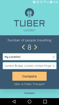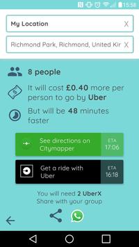 Compare fares Public Transport and Uber while travelling in a group in London. Choose the best option by comparing prices, get an Uber from the app button, and see directions on Citymapper. Tuber will tell you how many Ubers will be necessary for your group.