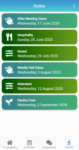 View all upcoming such as Attendant, Security, Sound, Platform, Microphones, Kingdom Hall Cleaning, Garden Care and more. Publishers can also submit their Field Service Reports to the congregation.