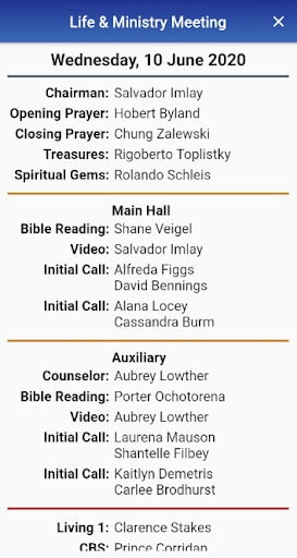 See your congregation's upcoming Life and Ministry meeting, Weekend meeting and Field Service schedules.