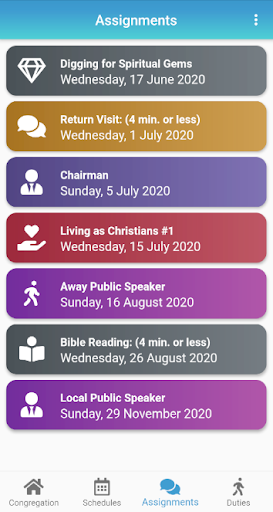 JWScheduler – Publisher Edition allows publishers to view upcoming Christian Life & Ministry meeting parts, Public Talk assignments, Duties, Congregation Events & Announcements. Publishes can also see upcoming Life and Ministry meeting, Weekend meeting and Field Service schedules, as well as submit their Field Service Reports to their local congregation.