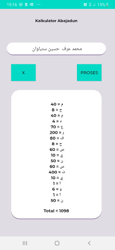 Cümleyi / Adı Arapça girin, uygulama Masyhur Abajadun masasına göre alfabetik değeri otomatik olarak görüntüleyecektir.