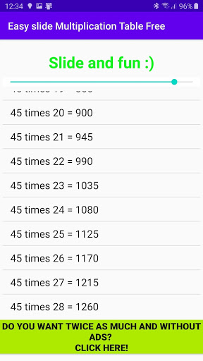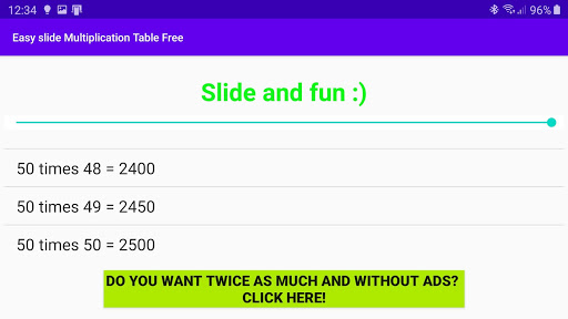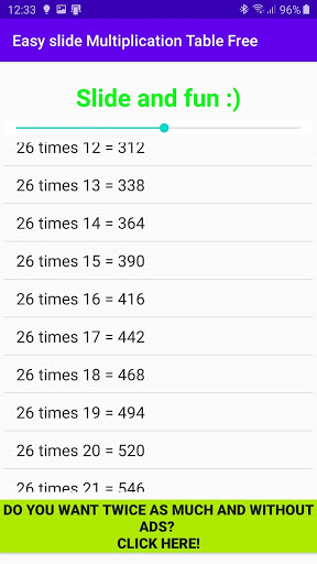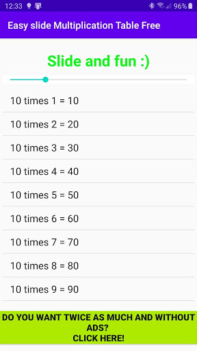 A revolutionary multiplication table. Just move the slider and the result of multiplication will appear in a second. Have fun learning, learn fun.