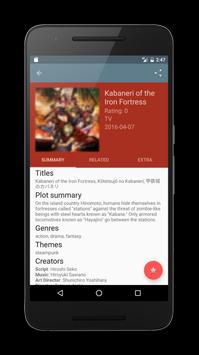 An android app that contains data for more than 17000 Anime and Manga, including titles, images or pictures but not wallpapers, ratings, plot summary, etc.