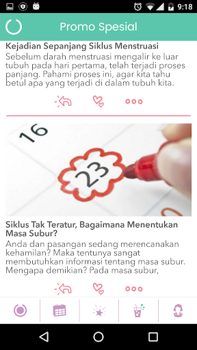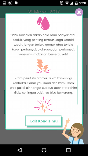 Di tengah kesibukan, Menstrual Diary mengingatkan kita berbagai gejala yang umumnya menyertai menstruasi, seperti; peningkatan cairan vagina, pusing, nyeri perut, mual atau cepat lelah; sehingga kita tidak lagi cemas tentang kondisi kesehatan jika mengalaminya. Menstrual Diary dilengkapi dengan feature sharing ke sosial media dan link ke artikel di menstruasi.com serta tanya jawab dengan dr.Laurier.