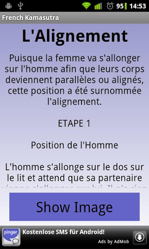 Lovingly written and illustrated exclusively for this Android app, Kamasutra spanish brings thousands of years of Kama Sutra experimentation into one incredibly fun and sensual app. View over 50 sexual positions, each shown and explained, and enjoy going from Beginner to Kama SutraMaster using the world39;s ultimate guide to sex. It is ahighly recommended app, with a pleasing interface. You may have difficulty not always looking at your phone againKeywords: Sex, positions, kamasutra, japanese games, fun, images sexy, girls, kissing, dating, love, spice, dice poker, football fun. sex positions, app, android, japanese language.Amoureusement crit et illustr exclusivement pour cette application Android, Kamasutra espagnol apporte des milliers d39;annes d39;exprimentation du Kama Sutra en un seul app incroyablement amusant et sensuel. Afficher plus de 50 positions sexuelles, chaque montr et expliqu, et profiter allant de dbutant matre Kama Sutra utilisant guide ultime du monde pour le sexe. Il est une application fortement recommande, avec une interface agrable. Vous pouvez avoir de la difficult pas toujours regarder votre tlphone nouveau