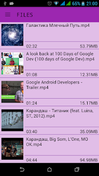 Simple video player for Android, which is itself on the device searches for all available files for playback. It supports most popular video formats such as: avi, mkv, mp4, mpeg, mpg, wmv and others. Enjoy watching your favorite movies and TV shows using the video player.