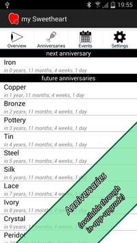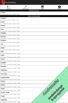 You are married? Great! Don't miss any anniversaries anymore! 'My Sweetheart' will show you all your passed and coming wedding anniversaries.