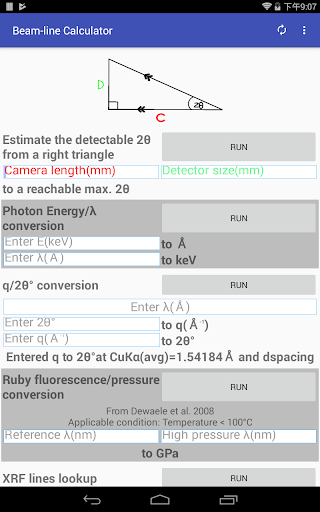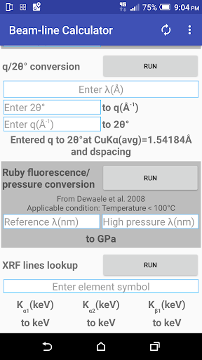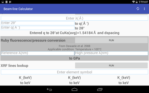 the "sample to detector distance" was named "Camera length" in the app!), Energy, Bragg d-spacing, wavelength independent q value, Ruby fluorescence/pressure, and do a X-ray Fluorescence lines lookup.