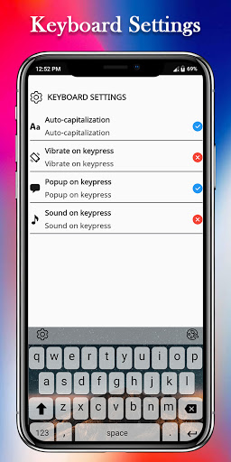 - By Keyboard for apple iPhone 12 pro is provided powerful settings manager, including popup keyPress, keyPress sound, vibrate, etc...
