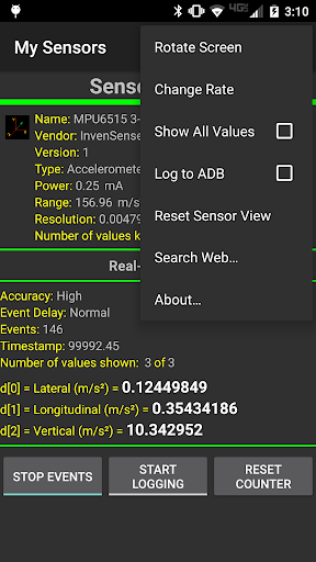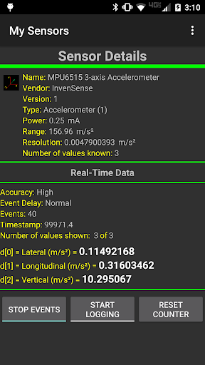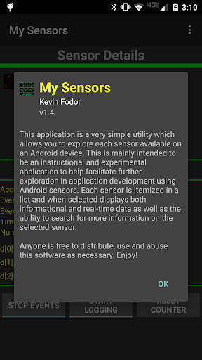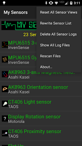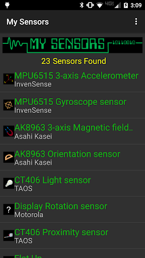 This application is a very simple utility which allows you to explore each sensor available on an Android device. This is mainly intended to be an instructional and experimental application providing a basis for further development. This application displays both static and real-time information about each sensor available. Additionally it allows real-time logging of sensor data to a file stored on your device.