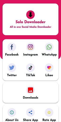 We have developed an innovative apps for your satisfaction Solo Downloader is a unique app that can download any video from your common social media apps. You can download facebook videos and photos, it is convenient to download instagram videos. If you like a twitter video download with this app so no problem. Sometimes you like a friends whatsapp status video and want to download it, so don't worry, just share this app with Solo Dowloader and have it in your phone memory. Similarly you can download tiktok videos and photos.