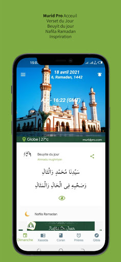 Murid Pro est une application qui aide les musulmans dans leur quotidien en leur permettant d'apprendre le coran et les khassidas (écrits de Cheikh Ahmadou Bamba MBACKE) avec récitations audio. L’application vous donne des nafilas pendant le mois de ramadan ,elle propose des notifications pour les heures de prières plus Adhan, selon la localité elle indique aussi la direction de la Kaaba grâce à la fonctionnalité Qibla.