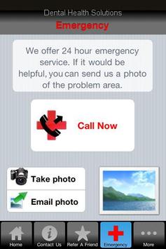 Dental Health Solutions provides this app for patients to easily contact the office, request an appointment, or request emergency treatment (and include a photo of the problem area if appropriate). It has info about the dentist, a picture gallery, and other important info about the dental office. You can even refer your friends! We hope you enjoy it and it enhances the service we provide to our patients.