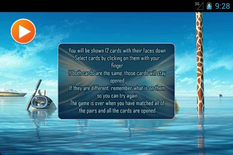 This wonderfull memory game about Madagascar animated movie. The game is for kids, but your grown-ups may find it challenging too.It will help to train your kids memory. It has amazing music theme on background and very beautifull design. Your child will love to spend time in this application, apart from that it will be very usefull for your kid.See Madagascar movie first to get to know all the characters.Spoiled by their upbringing with no idea what wild life is really like, four animals from New York Central Zoo escape, unwittingly assisted by four absconding penguins, and find themselves in Madagascar, among a bunch of merry lemursThe animals try to fly back to New York City, but crash-land on an African wildlife refuge, where Alex is reunited with his parents. Alex, Marty, Gloria and Melman are still fighting to get home to their beloved Big Apple. Their journey takes them through Europe where they find the perfect cover: a traveling circus, which they reinvent - Madagascar style.Starring this application:- Alex- Marty- Melman- Gloria- King Julian XIII- Skipper- Kowalski- Rico- private - Maurice- Mort- Mason and Phil- Zuba- Florrie- Moto Moto- Vitaly- Gia- Stefano- Sonya- The Andalusian Triplets- The Dancing Dogs********************************END USER LICENSE AGREEMENT:********************************All images used in this software product are owned by Dream Works and are copyrights of their respective owners. All title and intellectual property rights in and to the content which may be accessed through use of the software is the property of the respective content owner and may be protected by applicable copyright or other intellectual property laws and treaties.This app is not affiliated with Dream Works. Images in this app are used under the fair use provision of the Copyright Act for purposes of reporting. information shown in this app is gathered from the various internet sources including Google news, Flickr, Twitter, and Youtube.