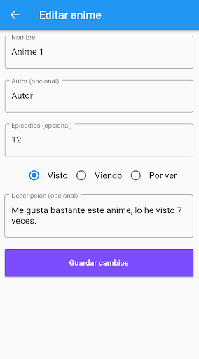 Questa app è composta da una lista anime per vedere , Un altro per coloro che hanno visto e un altro per coloro che stanno attualmente guardando, questo ti aiuterà molto a gestire così tante animazioni giapponesi che esistono.