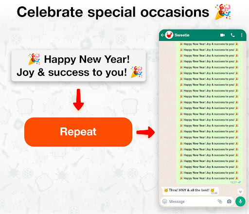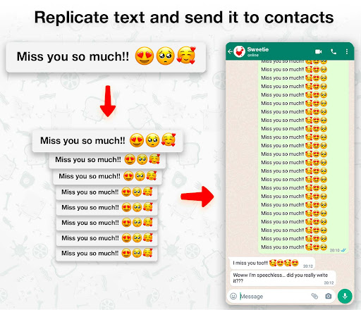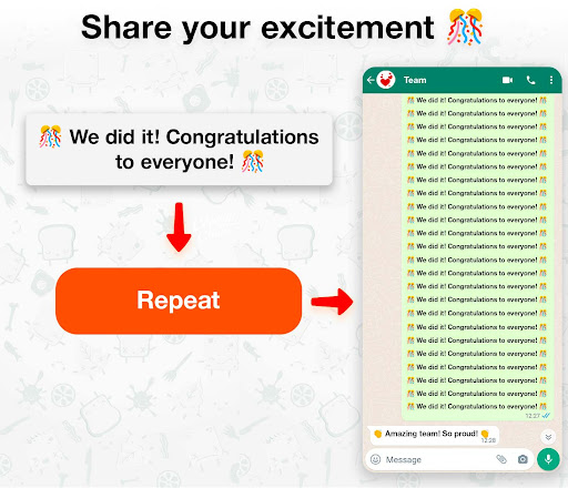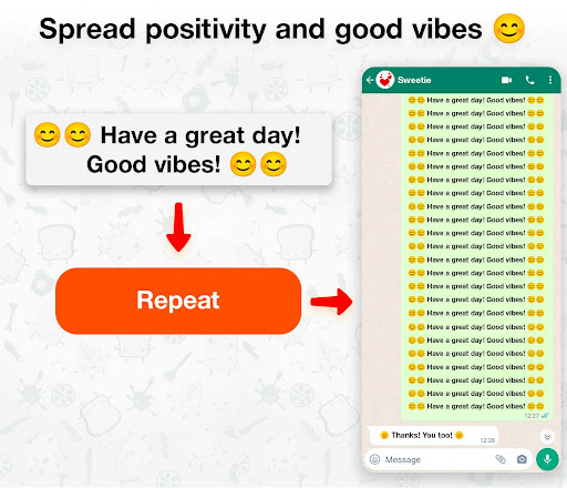 Are you tired of repeatedly sending the same phrase or message to someone? You only need to click once to send your message many times with our text repeater app. Also, our program provides a predefined list of most frequently used sentences from which you can choose, replicate and send to your contacts. The text repeater app supports emojis and other formatting options, enabling you to generate memorable and enjoyable messages.