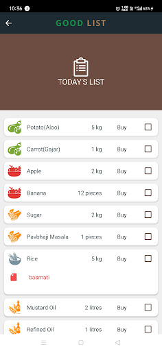 Add items in your Good List as they cross your mind. Good List has already extensive inbuilt list of Vegetables, Fruits, Cereals, Spices, Edible Oils, Bakery Products and Personal Care Items. You can also edit and add custom items. With every item, you can define the quantity required and add specific notes.