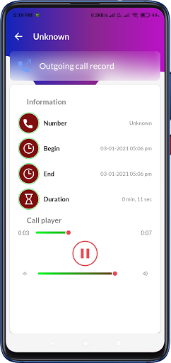 Search for recordings by contact or phone number. There is no limit in to call recording time it can save upto hours.