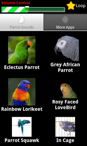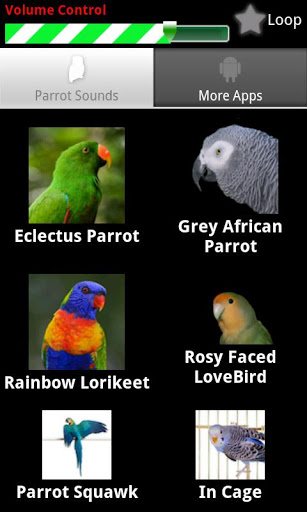 Listen to real parrot sounds anywhere anytime.Plays Parrot sounds with a great volume control Entertainer for kids and parents alike who like parrot both as pets and talking Parrots. Parrots, also known as psittacines are birds of the roughly 372 species in 86 genera that make up the order Psittaciformes found in most tropical and subtropical regions. Their beautiful appearance and elegant voice and ability to mimic human sounds are always attractive to kids and adults.The Parrots that are included here are Eclectus Parrot, Grey African Parrot, Rainbow Lorikeet, Rosy Face Lovebird. Play parrot sounds any time of the day you want. Who wants apps like Talking Parrot with simulated parrot sounds when you can hear real parrot sounds?