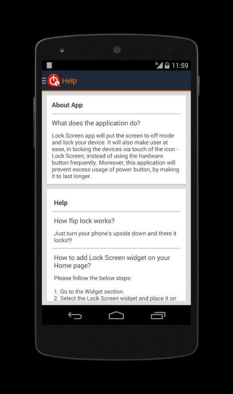 Lock Screen app will put the screen to off mode and lock your device. It will also make user at ease, in locking the devices via touch of the icon - Lock Screen; instead of using the hardware button frequently. Moreover, this application will prevent excess usage of power button, by making it to last longer.
