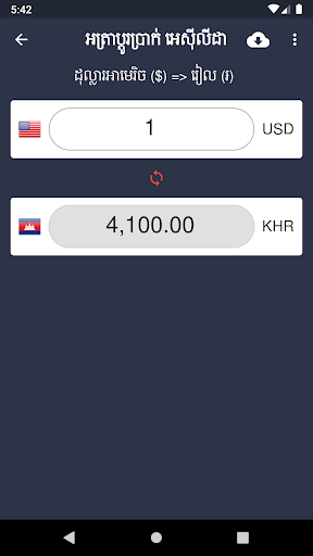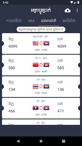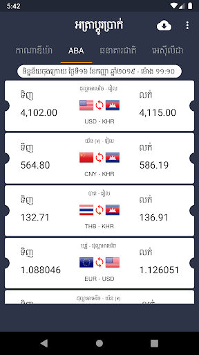 Khmer Exchange Rate app helps you to know about everyday exchange rate from ACLEDA, ABA, Canadia, and NBC Bank.