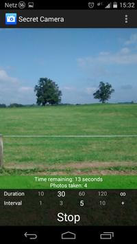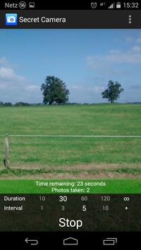 When you start Secret Camera you can choose how long (duration) and in what intaval Secret Camera is taking photos. After you click "Start" the App starts taking photos with your choosen preferences. You can than close Secret Camera, use other apps or turn off the display. Secret Camera dosnt stop until the duration is expired or you click "Stop". The photos can be viewed in the build-in gallery. They are hidden in any other gallery.