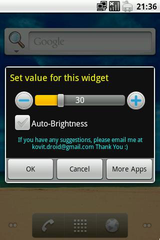 This app let you change your screen brightness in one touch. Just add "One Click Brightness Widget" to your home screen and select level of brightness that you want to change when touch this widget. You can create multiple widgets with different brightness level.