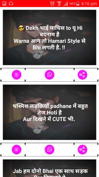 Show your attitude & personality with these Attitude Status & Shayari in Hindi. The best whatsapp status in hindi app helps you stay in touch with family and friends. All New 2020 status messages.User can daily set the unique status message in thier Whatsapp and Facebook. This Attitude Application is completely free and easy to use with nice user interface. Every hour online Attitude shayari, online hindi status,jokes. Attitude Status application is present large collection of Status or Shayari in Hindi & English Language.